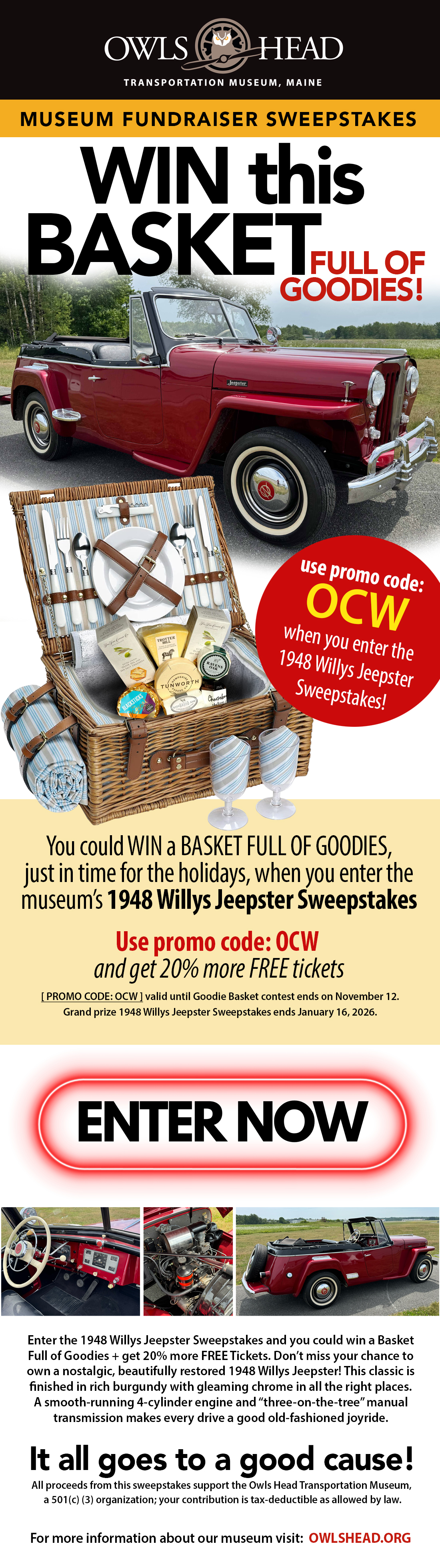 LIMITED PROMO • A Basket Full of Goodies could be yours when you enter the 1948 Willys Jeepster Fundraiser Sweepstakes